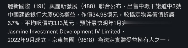 林建岳旗下集团所持有的中国建设银行大厦位于中环干诺道3号,丽新发展持有一半的业权,另一半的业权在建设银行手上。丽新发展自从上半年传出了财困问题后,要出售该物业五成权益的传闻此起彼伏,而买家也各有不同,林建岳对此一直不置可否,如今也总算一锤定音,买家为内地企业京东。丽新发展最新发布的通告称,出售的协定价为34.98亿,在出售这个大厦的业权,并且偿还相关贷款后,将会套现24亿的现金,这大大缓解了负债压力。