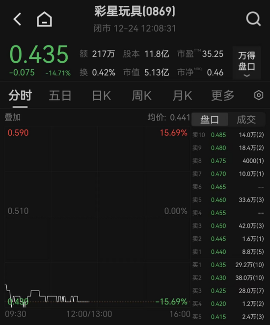 12月24日,彩星玩具(00869.HK)开盘后直线下挫,盘中跌幅一度超过15%,刷新2023年4月以来新低。
