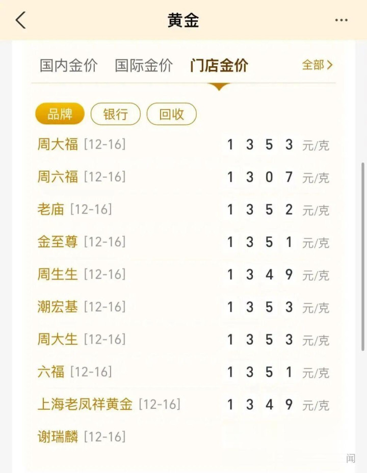 受此影响,国内品牌金饰价格多日连涨态势也随之终结。中新经纬16日查询到,周生生足金饰品报1349元/克,较昨日跌4元/克,终结自12月10日起的五连涨;周大福、老庙黄金、老凤祥等品牌,金饰克价较昨日保持不变。